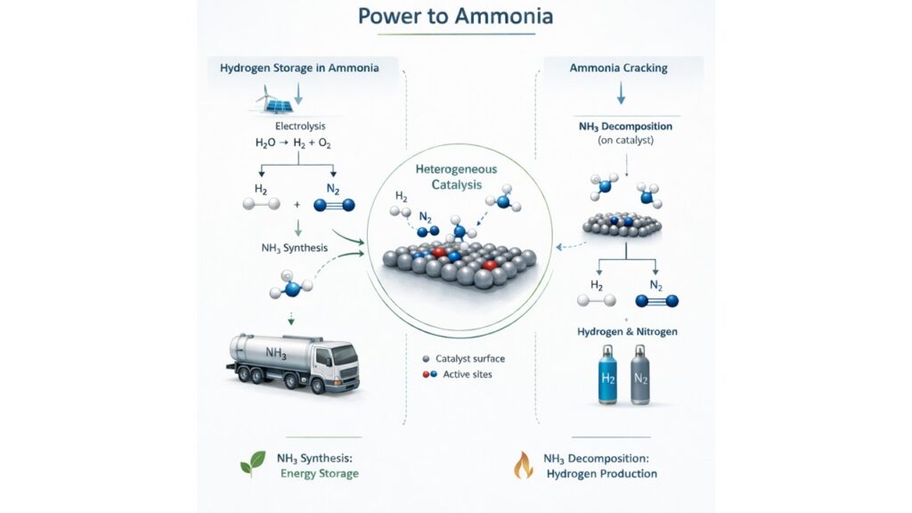 Ce changement de paradigme induit de nouvelles contraintes sur les conditions opératoires Température/Pression (T/P) de la synthèse, et par conséquent sur le développement des catalyseurs hétérogènes associés. Toujours dans l’optique de l’utilisation de NH3 comme média de stockage de H2, la réaction de craquage doit également être optimisée d’un point de vue catalytique, le procédé étant aujourd’hui inexistant, or la littérature montre clairement que les catalyseurs actifs pour la réaction de craquage ne sont pas nécessairement les meilleurs pour la synthèse. La constatation inverse est également valable.